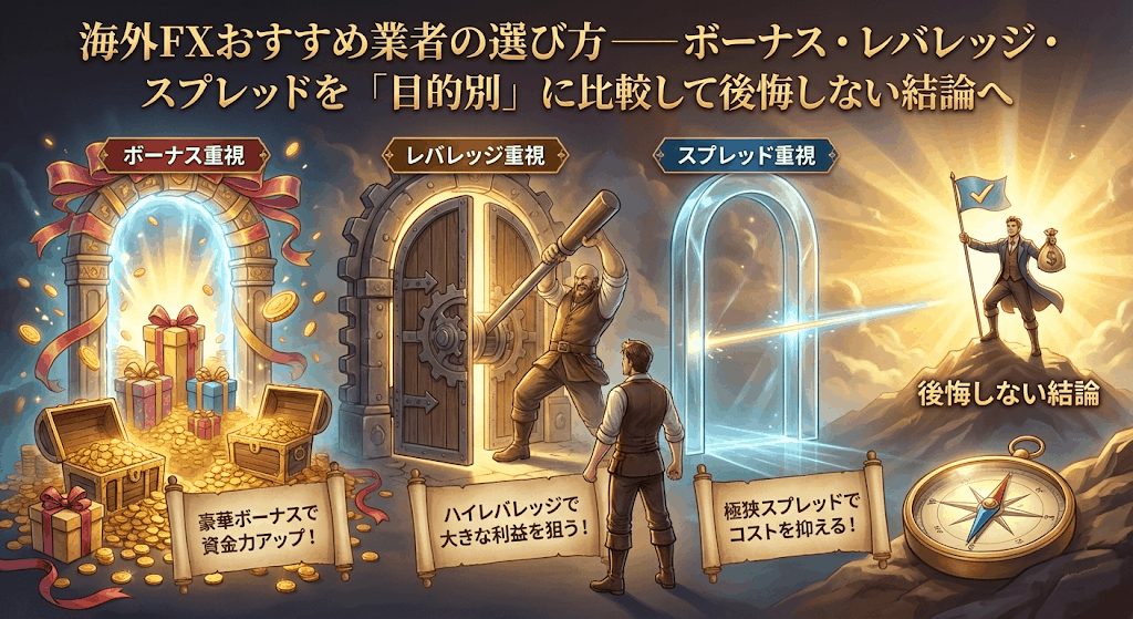 本記事では、海外FX業者を選ぶ上で重要な「ボーナス」「レバレッジ」「スプレッド」の3要素を軸に、代表的な海外FX業者の特徴を比較し、目的別におすすめできる業者像を整理します。